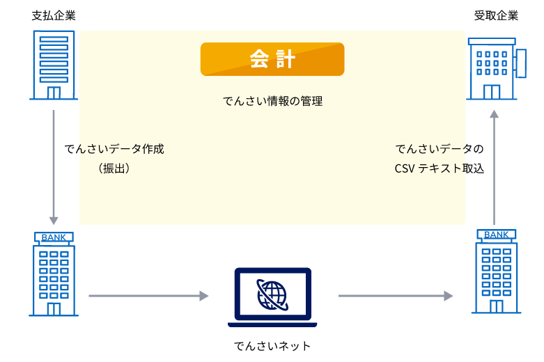 取引先から受け取ったでんさい、自社が振出・譲渡したでんさいの情報を管理できます。支払伝票をもとにでんさい振出用ファイルが出力されるので、インターネットバンキングへの二重登録が不要となります。