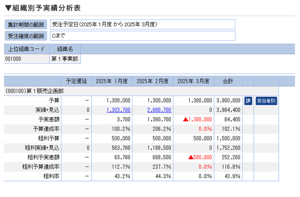 部門単位から担当者レベルまで詳細な予算登録が可能です。予算に対する実績の状況をより詳細に把握・分析することで、ボトルネックとなっている箇所の把握、要因となっている案件の確認をスムーズに行えます。
