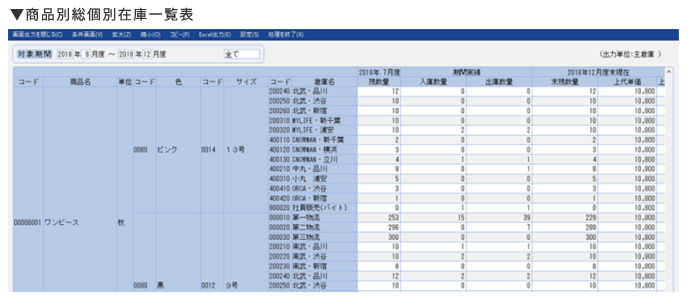 在庫は色サイズ別に把握することができます。在庫情報をリアルタイムに把握することで、より正確な倉庫在庫・店舗在庫の管理が実現でき、不良在庫の抑止を可能とします。