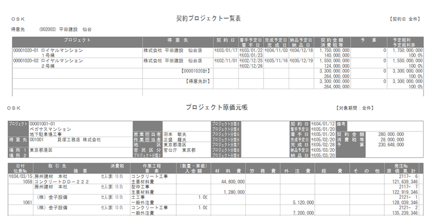 プロジェクト情報の管理や、予算実績管理、多彩な原価管理諸表の出力が可能です。