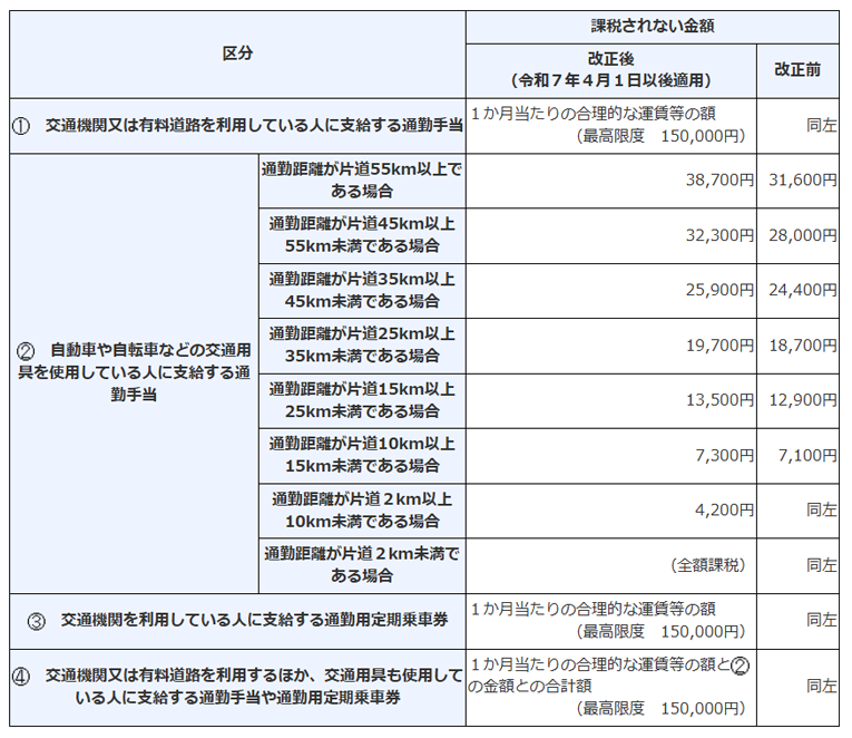 改正後の非課税限度額は、2025年4月1日以降に支払われるべき通勤手当に適用されます。公共交通機関等を利用する場合の上限(月15万円)に変更はありませんが、車通勤などの場合は距離に応じて引き上げられています。改正前後の比較表は図1のとおりです。