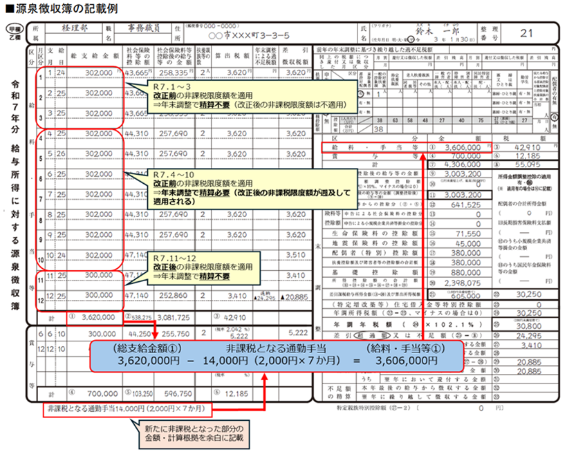 国税庁の源泉徴収簿の記載例では、新たに非課税となった金額とその計算根拠を余白に記載するようにありますが、給与ソフトで正しく年調年税額が算出できる場合は、記載を省略しても構わないことになっています。お使いの給与ソフトの対応を確認しておきましょう。
