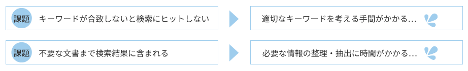 従来の文書管理システムにおける検索は、ネット検索のように、検索窓にキーワードを入れたり、目的の資料が見つかるように慎重にキーワードを選定する必要があり、以下のような課題がありました。