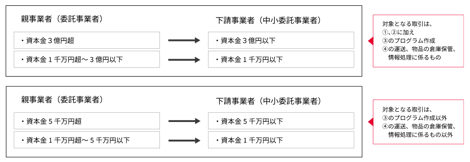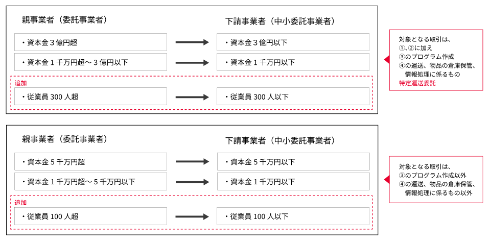 資本金、従業員数の基準に関する要件は、適用対象となる取引(①製造委託 ②修理委託 ③情報成果物作成委託 ④役務提供委託)により以下の2パターンとなります。