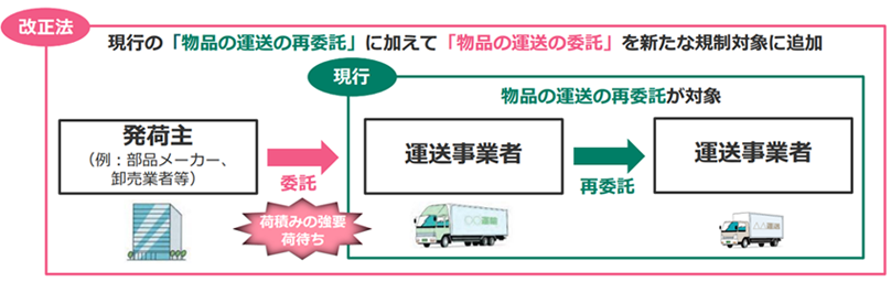 下請法の適用対象となる取引のひとつに「役務提供委託」があります。運送の委託については、これまでは物品の運送の再委託のみが対象とされていましたが、発荷主が運送事業者に対して物品の運送を委託する取引が「特定運送委託」として追加されました。