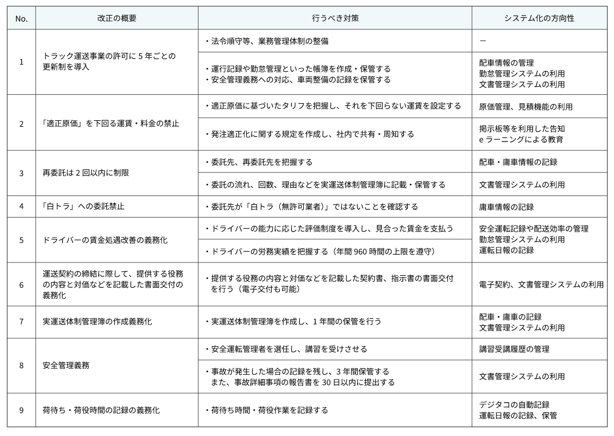 これらは単なる法令順守にとどまらず、取引先から「選ばれる物流業者」になるための対策でもあるのです。まずは、社内の体制を整備し、必要な対策を検討することから始めませんか。