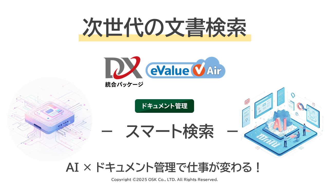 OSKの「DX統合パッケージ eValue V Air / eValue V 2nd Edition」は、企業内の情報整理、伝達、共有に必要な機能を網羅し、部門を超えたコミュニケーションを実現します。
