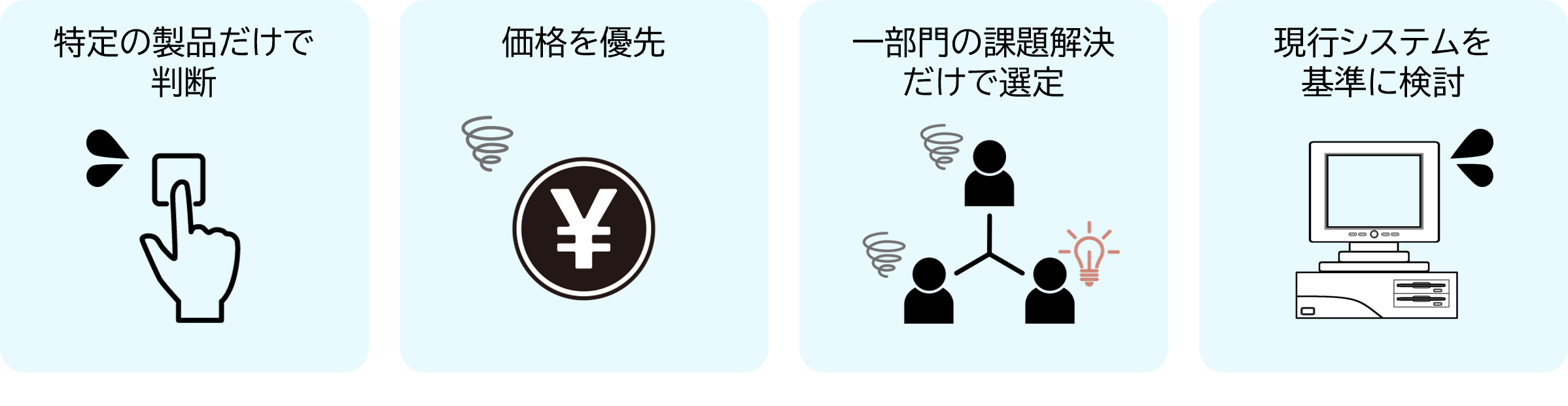 導入を成功させるためには、選定段階での判断が重要です。選定時に注意すべきポイントとして、以下のようなことが考えられます。