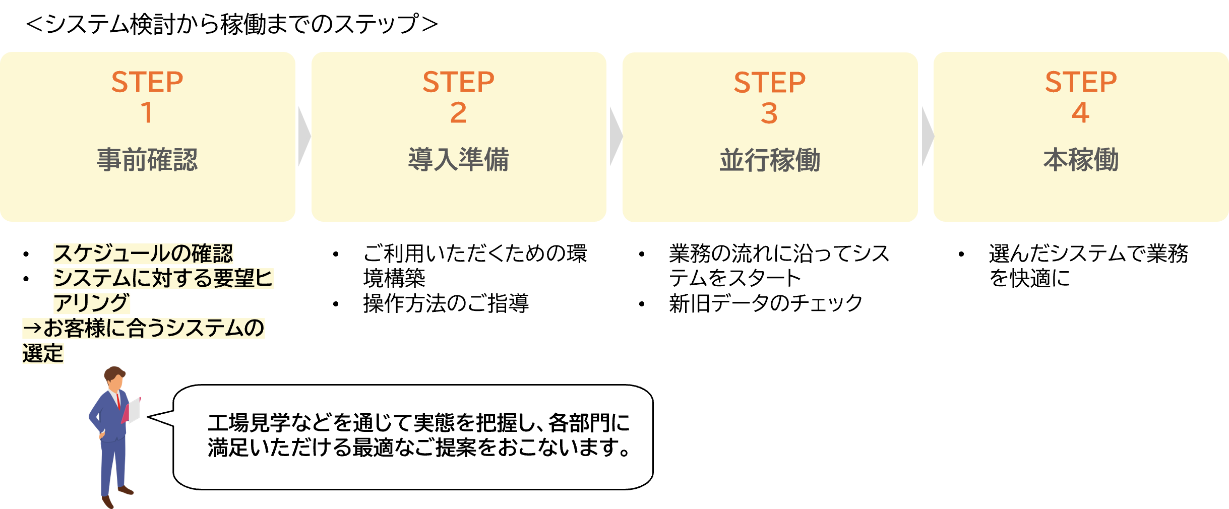 さらに稼働後も、専門スキルをもったエンジニアが問合せなどに対応するので、生産管理システムを安心してお使いいただけます。